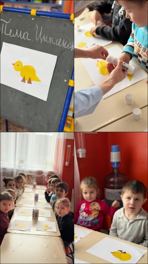Цель: Познакомить детей с техникой создания с использованием цветной бумаги.Учить создавать образ цыпленка из разных материалов.