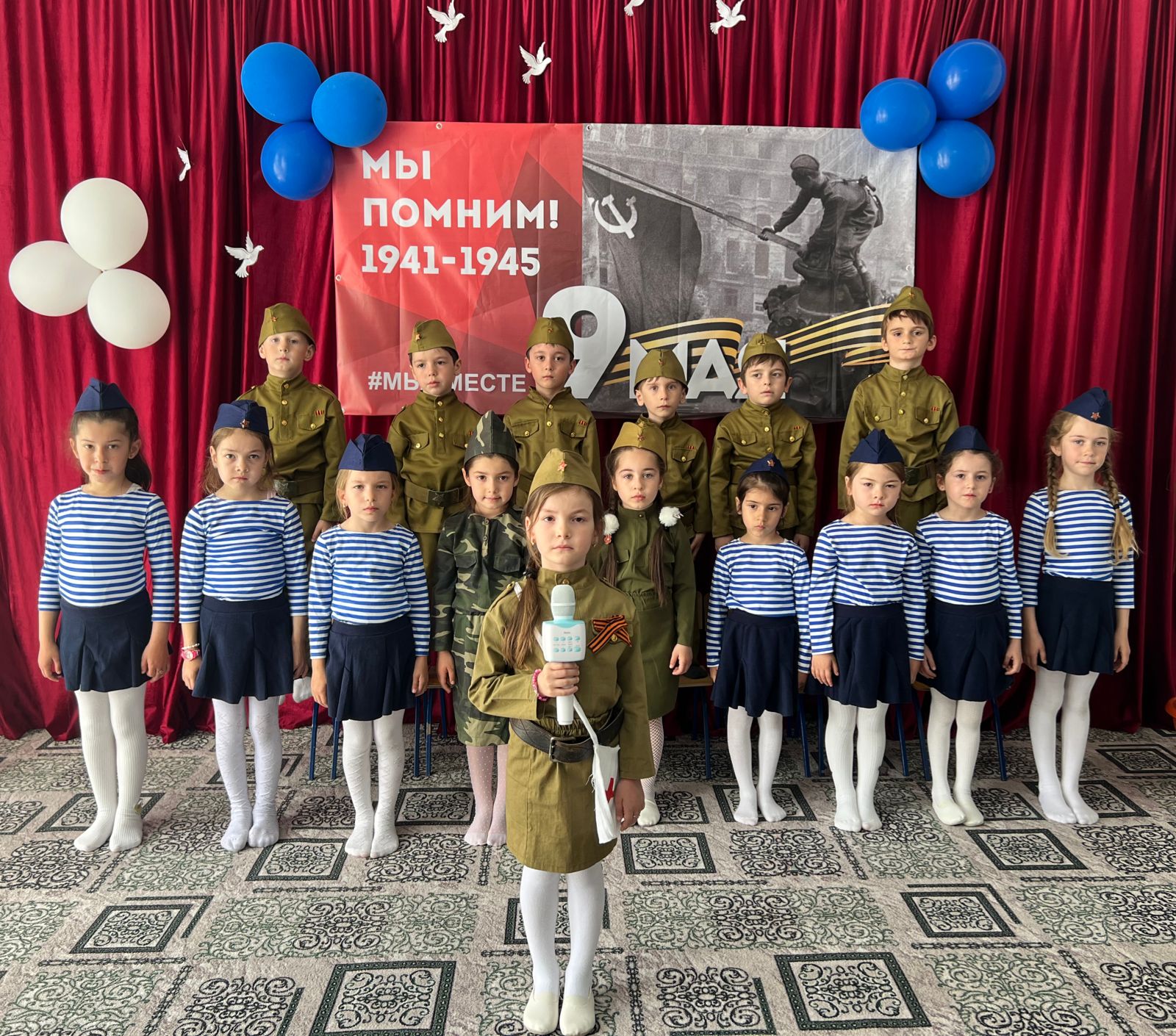В средней группе «Котята» и в старшей группе «Чебурашка» прошли утренники посвященное празднованию Дня Победы. Предварительно с детьми в группах были проведены занятия, беседы о подвигах советских людей, оформлены родительские уголки, а праздник стал итогом этих мероприятий. Дети показали танец «Синий платочек», с флажками и цветами «День Победы», пели песню «День Победы», «Победный марш». Дети вместе с педагогами и родителями исполнили песню военных лет «Катюша».